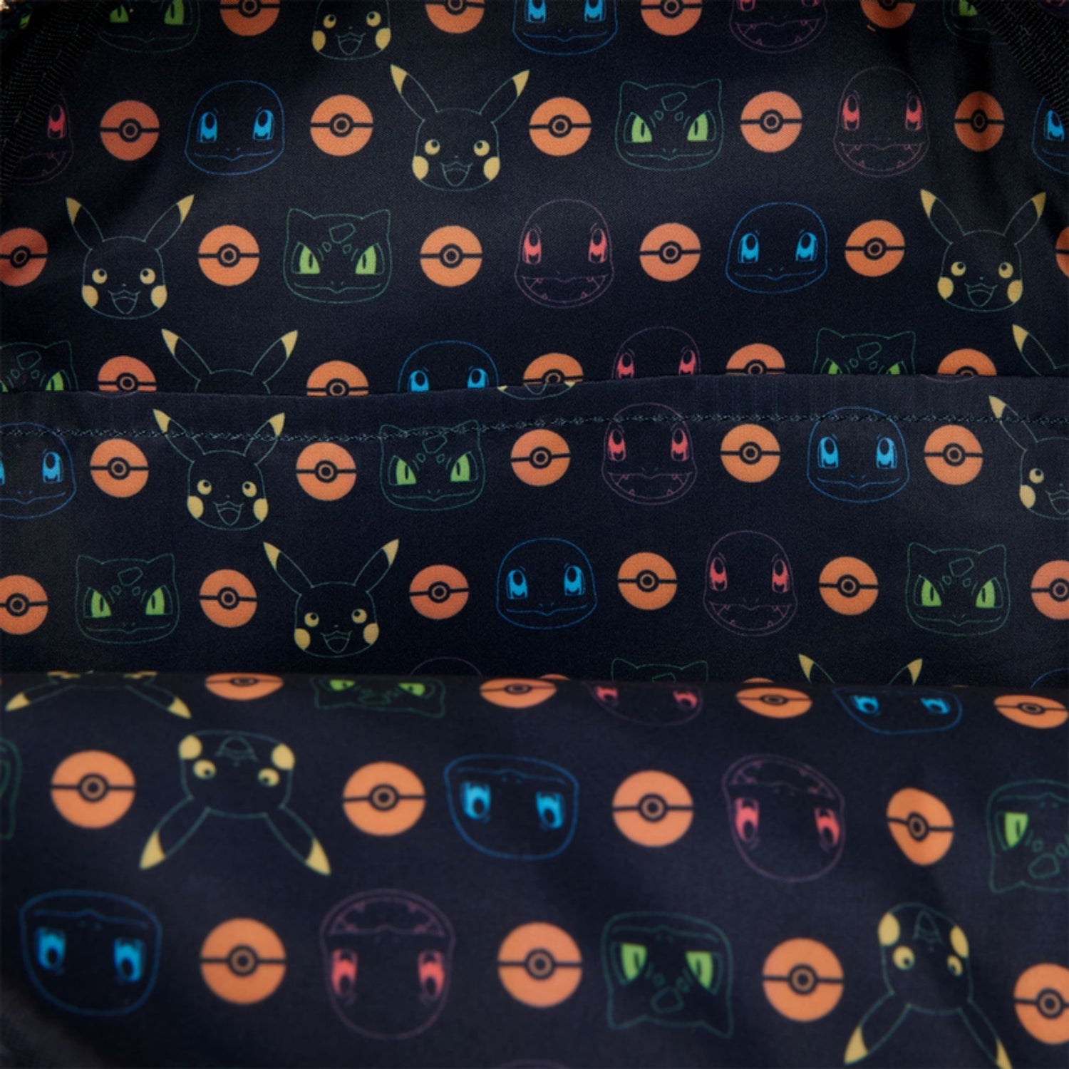 This bag features an all-over debossed pattern of some of your favourite Pokémon. On the quilted front pocket, you'll find a molded metal charm of a Poké Ball.